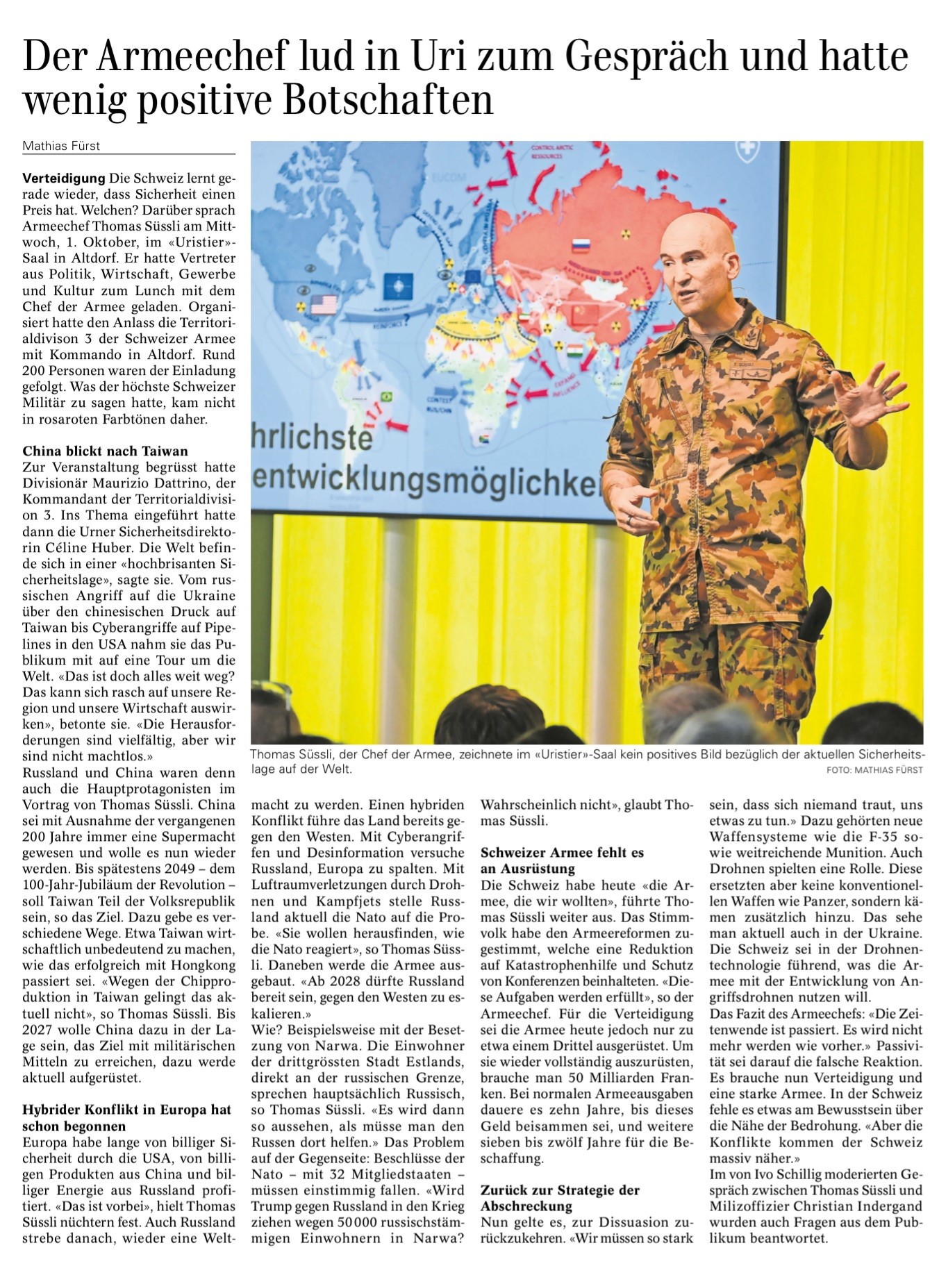 04.10.2025 Urner Wochenblatt: Der Armeechef der Schweiz lud in den Uristier-Saal auf dem Dätwyler Areal ein