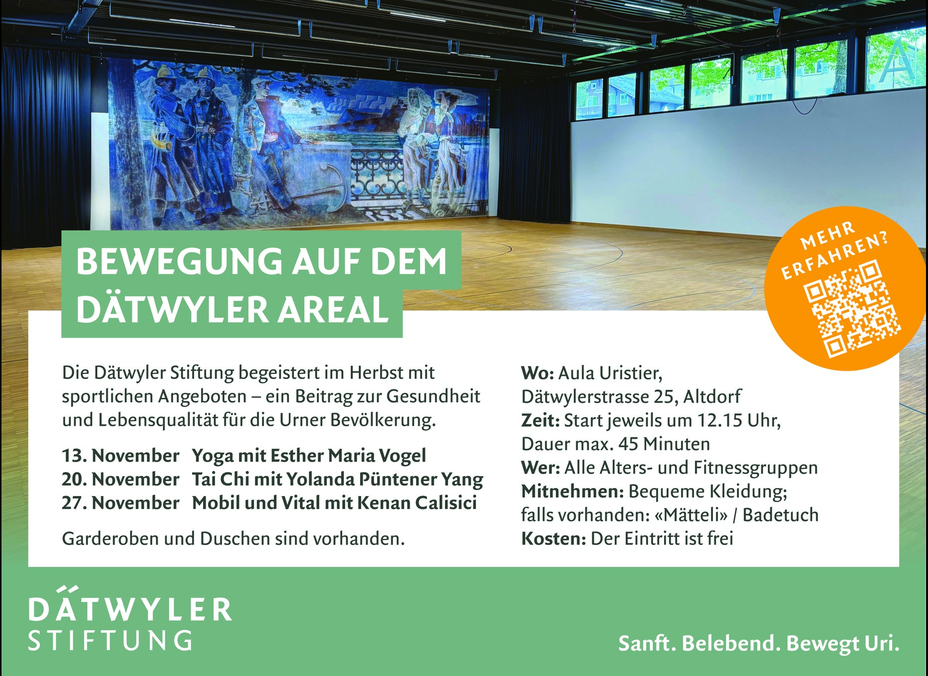 Die Dätwyler Stiftung begeistert im Herbst mit sportlichen Angeboten auf dem Dätwyler Areal. Nach der erfolgreichen Bewegungsserie im Sommer im Haus der Musik folgt eine Indoor Variante in der Aula Uristier. Ein Beitrag zur Gesundheit und Lebensqualität für die Urner Bevölkerung.